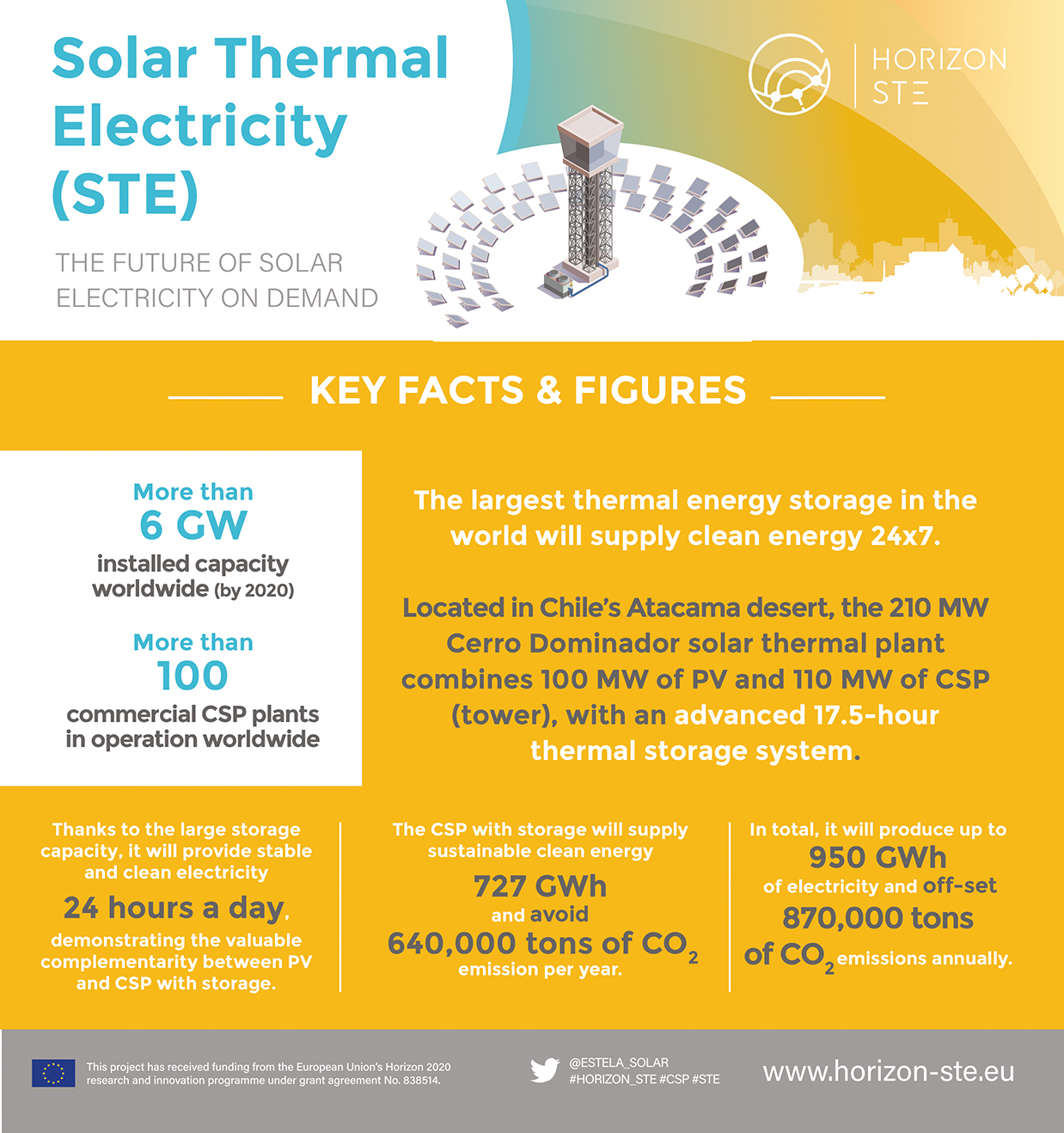 Solar thermal electricity (STE) technologies, also known as concentrated solar power (CSP), use mirrors to concentrate the sun’s heat onto a receiver for either, driving traditional steam turbines or engines that produce electrical power, or using directly the heat for industrial processes.
